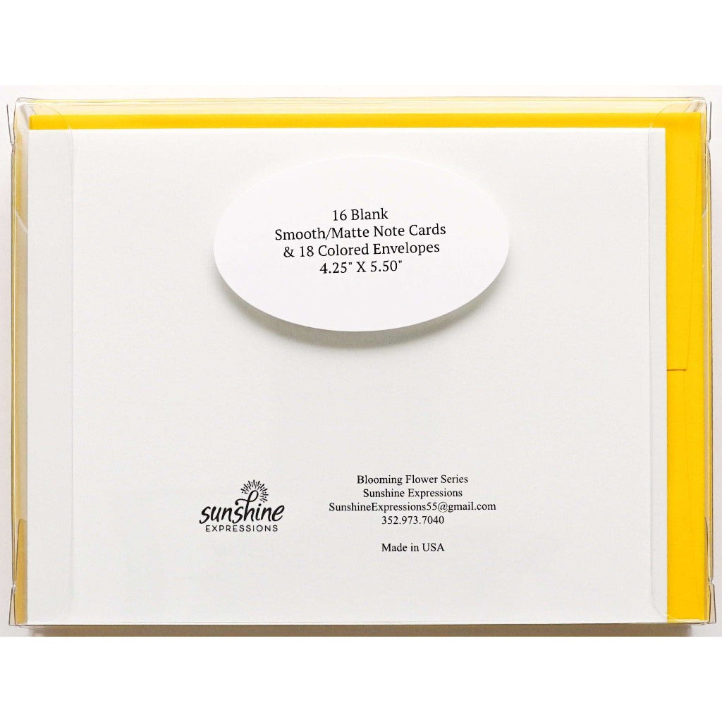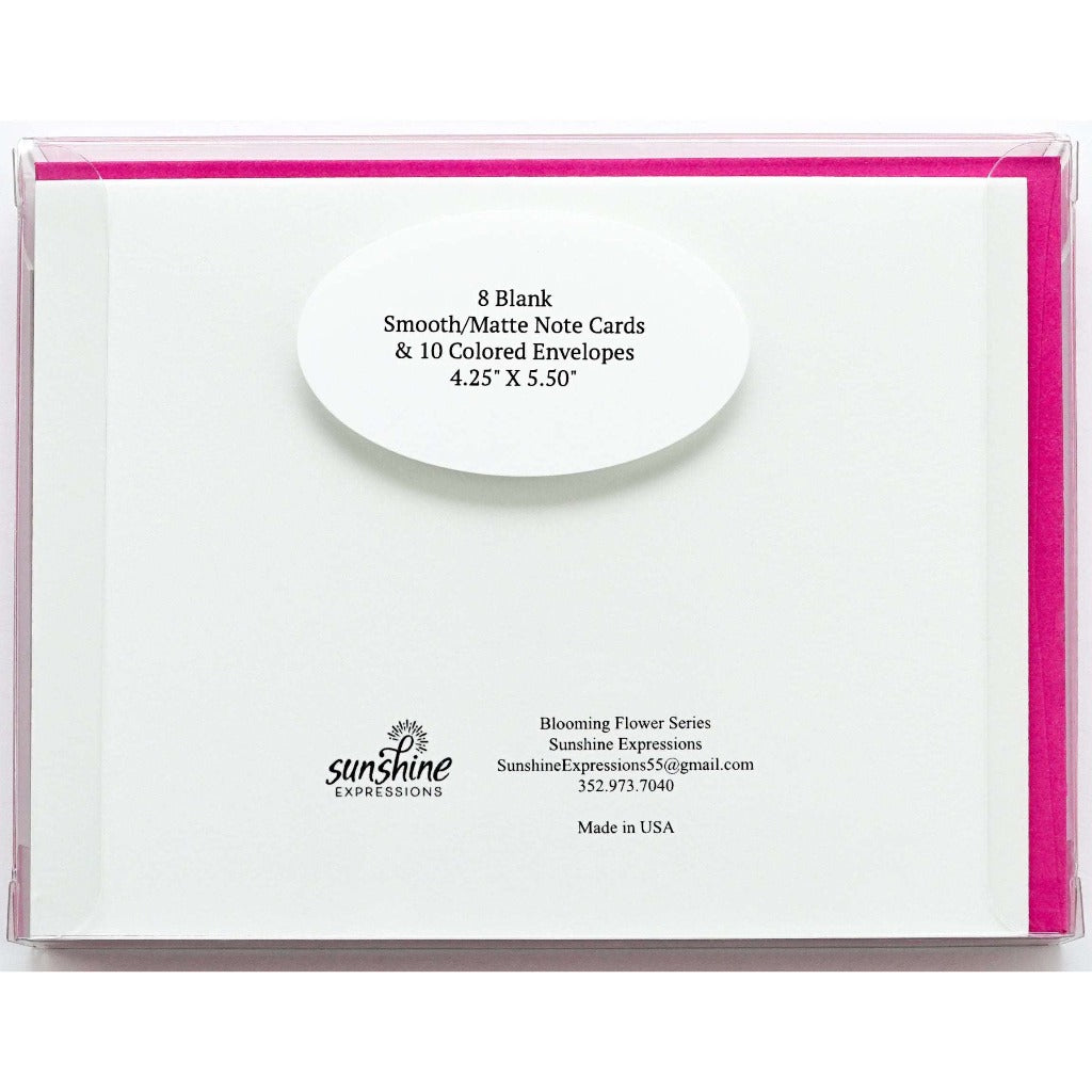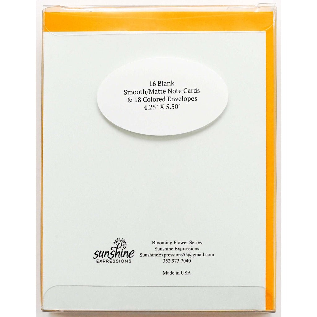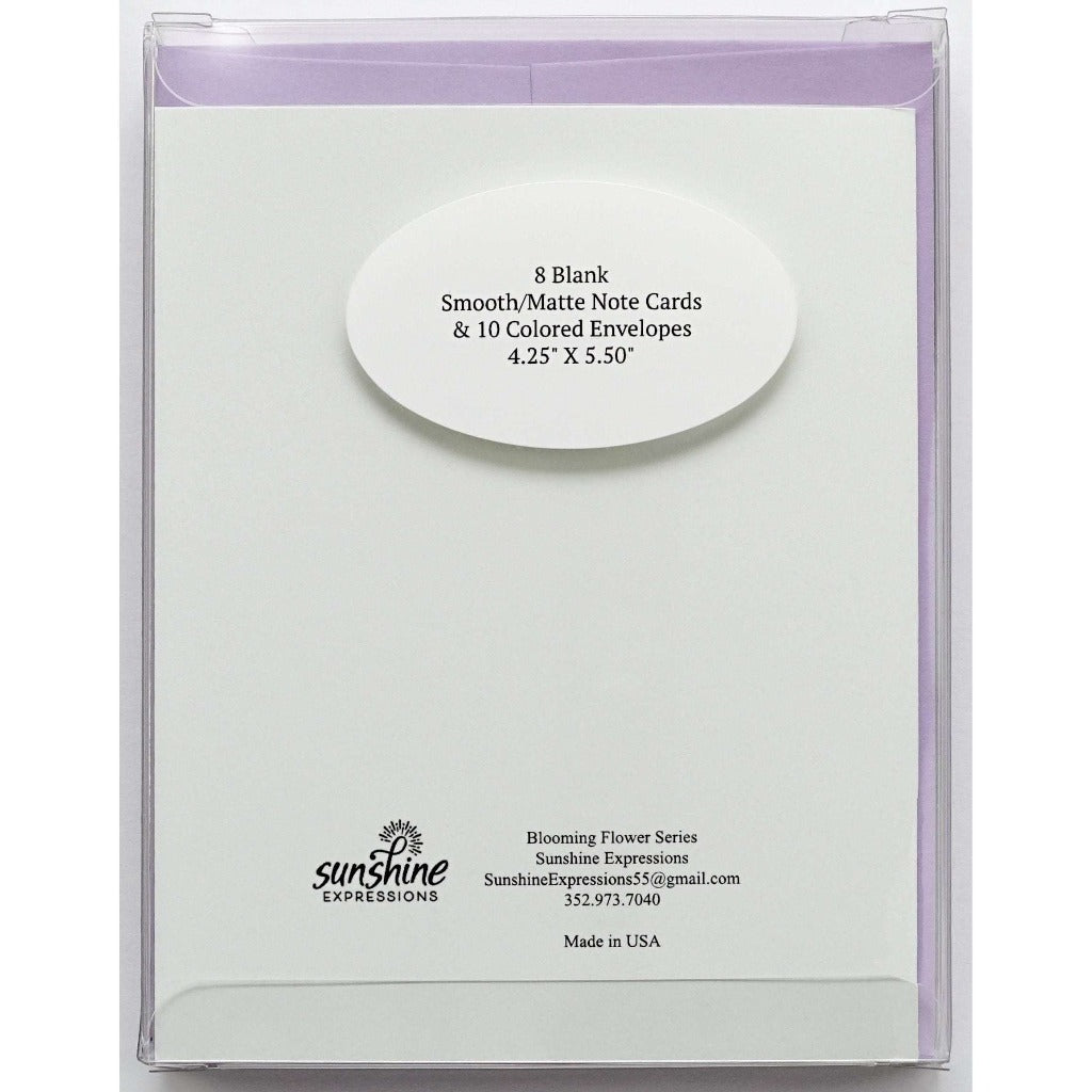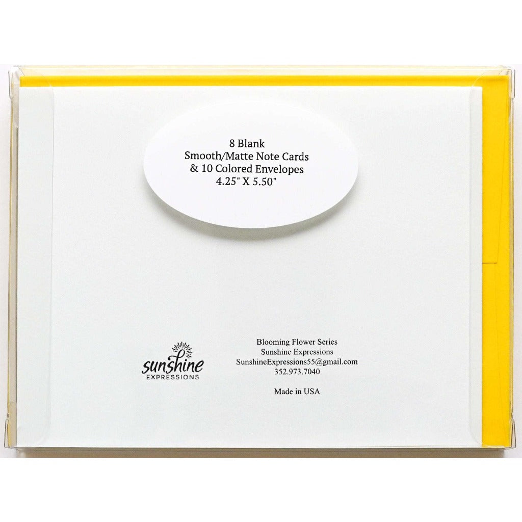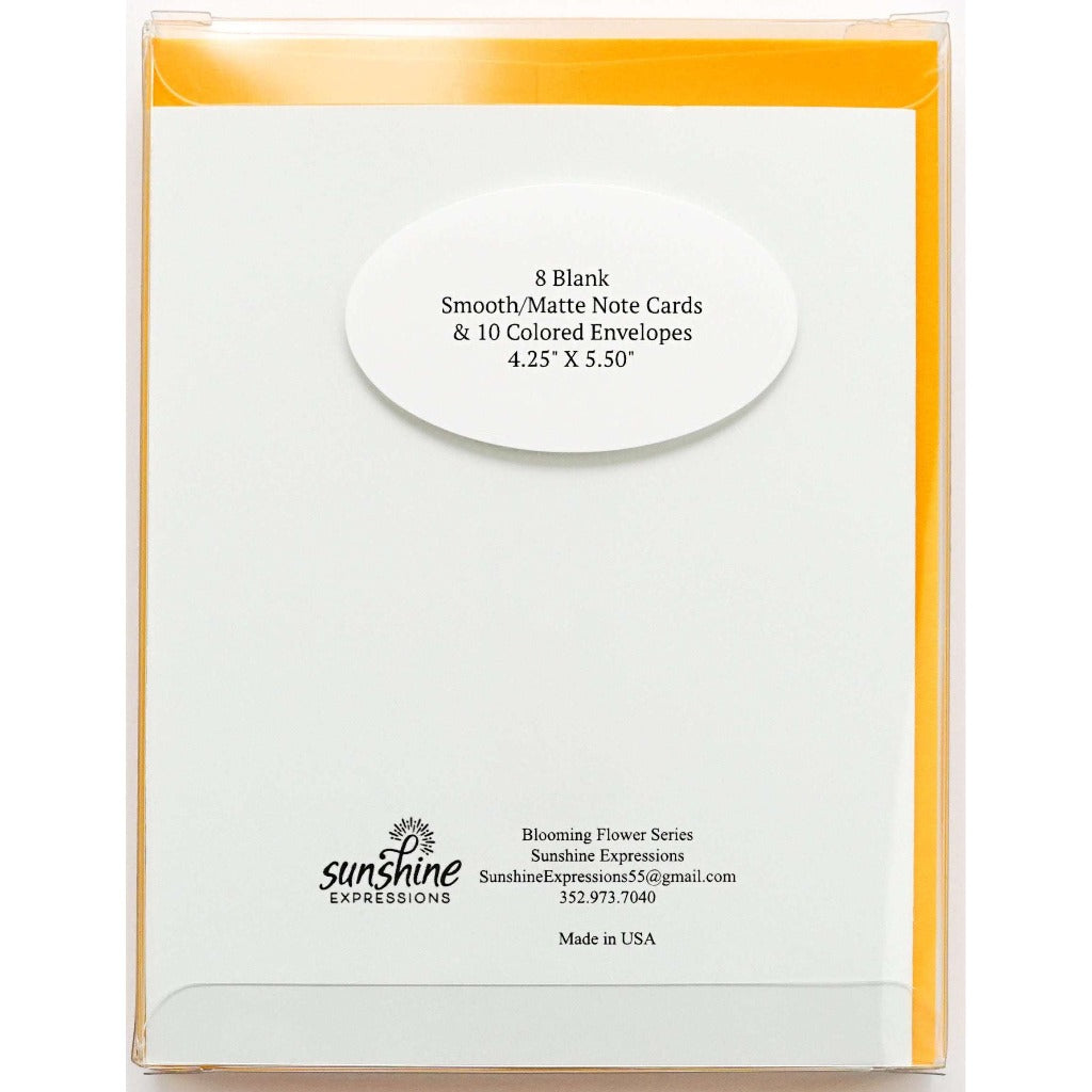 Brighten Their Day with Sunshine Expressions blooming flower note cards. Beautiful and elegant, our blank note cards leave a lasting impression and we make sure the message is delivered right to the heart! Our note cards can be framed as a unique gift.