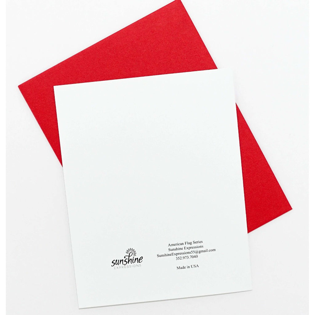 Make it Personal: The American flag is a symbol of freedom and liberty. Writing on an American flag note card with an encouraging message from you with Sunshine Expressions means the message you write will be even more special and unique. Writing your own messages of love, praise, encouragement, or support the receiver will surely feel your thoughtfulness.